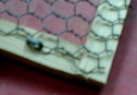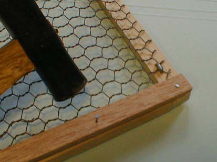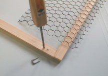 @木枠でフレームを作ります。※釘は200円で1,000本以上入ったお徳用を用意しておくと何かと便利です。 Aフレームに合わせて網を切ります。 B柱に配線を止める金具を利用して網を止めます。 ※ポイント:木枠が細く割れ易いため、ある程度キリで穴をあけておきます。 |