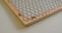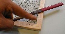 こんな感じで打ち付けていきます。 角の木の合わせ方は、交差のさせる事で若干の強度を持たせることができます。又、フレームの1.5倍程度の広さのしっかりとした板を化粧板として使うと、さらに強度が得られるので、大きな網面を作る時などの、ねじれが心配な時はそのようにする事をお勧めします。 |