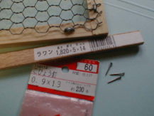 網の打ちっぱなしで鳥が怪我をするんじゃないか、と心配な方は、ラワン材などの安くて柔らかい材を、化粧板として使われる事をお勧めします。 この固定は“こびょう釘”で充分です。(左図は230本入りで60円の釘です。) ※化粧板をつけた場合、この面が表面になります。 |
