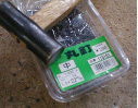 ベニスズメは、爪が伸び易く注意が必要と聞きました。餌場に近い止まり木にサンドペーパーを巻きました。配線コードを束ねる時に使うインシュロックで固定しました。(右図) 又、普段から少しづつ爪を削るための小道具として、家の壁などに貼る接着剤付きの薄いレンガを、壷巣の傍や餌場のそばに設置しました。(餌場特集の図参照) |