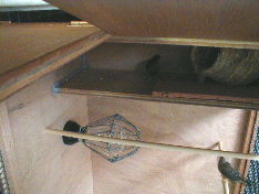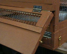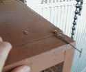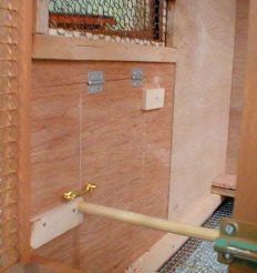 天井は巣箱内がメンテナンス出来るように開口部を作ります。この開口部は 、ヒーターの電球交換や壷巣の交換、検卵などに役立ちます。天井は小鳥の力で開く事はありませんので、配線コード用のステープルを工夫して、簡単にロックできるように小細工をしました。 |