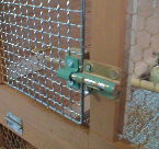 相変わらず、この扉にはバーベキュー用の小さい網を使いました。これが一番加工しやすく簡単。 施錠は、100円のカギで充分(左図)です。 |