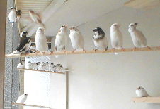 1羽いた雛も、巣立ちしたようですが、うまくまだ飛べず、金網を伝って仲間のいる止まり木に登っていました。帰りもあまり上手に飛べないので、ぽてっ!と落ちていました・・・頑張るのはいいけど、骨折するなよ〜っ・・・。 |