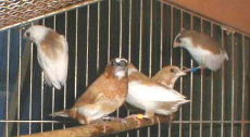 尾羽を全部抜かれてから約2週間程ですが、その後はいじめられることなく順調に育っています。針のような羽がお尻からにょきにょき生えてきました。立派な尾羽になるには、1ヶ月はかかるのでこのまま様子見です。大きな巣箱に茶系十姉妹を移したのですが、この親子はいつも行動を共にします。なんと仲の良い・・・やっぱり一緒に生活した者同士・・わかるんだね。 |