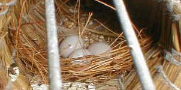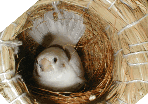 | 2001年9月8日 | 虚弱雛のまま巣立ち | 先週報告した雛たちは、もう壷巣にはいません。何かの拍子に巣立ちしたようで、ヒーターの上にしがみついていました。巣立ちには、まだ少し早かったのか足が悪いのか・・見ての通りの状態です。 また、他の巣には卵もありました。まだ検卵はしていませんが、ゆっくり様子を見ます。先週報告した卵のあった巣には、もう卵はありません。足に引っ掛けて下に落としてしまったようです。 |