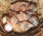 | 取り出す時期 | 頭に羽根の形跡が無い時は、まだ早いと思います。左の写真のように、頭に針のような羽の芯が出てきた頃が良いです。 もう少し小さい時(頭がツルツルの時)でも可能ですが、餌を与える期間が長くなりますし、生きる力が弱い時期に差し餌をする事になりますので、リスクを大きくするだけです。 逆に、遅くなると警戒心が生まれて餌を食べてくれません。 孵化してから、2〜3週間というところで、壷巣から取り出しましょう。 |