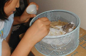 | いざ雛の口へ・・・ | 最初は口を開けません。 スポイトの先で、くちばしを軽く突付いてやります。それでも駄目なら、くちばしの付け根の辺りに向けて突付いたり、水で濡らしてやると口を開けるきっかけになります。 十姉妹の場合、口が小さいので、我が家の場合は竹製の耳掻きを使います。すり鉢で軽く砕いたムキエサに少し水を含ませ、耳掻きの先に付けて与えます。下の画像は、小学校4年生の娘が雛に餌をやっているところです。子供でも簡単にできますが、耳掻きの先で喉を傷つけないように慎重に行います。 |