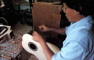 「作業場は2階です」といいながら1階の居間でコーヒーを入れてくれた。子供の頃から音楽と木工が好きで、それが高じてギターづくりの世界に入ったという。壁際においてあるスピーカーも手作リの自信作。スピーカーの上にはギターのパーツの木が縦横に整然と積まれている。