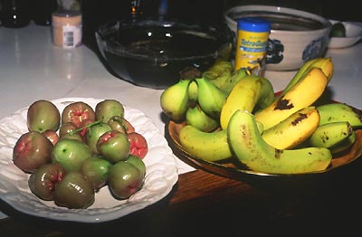 | 民宿あけぼの館の夜は、夕食後にフルーツをつまみに泡盛を飲みながら毎夜夜更けまで雑談、フルーツと泡盛の組み合わせは初めて経験したことであるが、特に完熟パイナップルとの組み合わせは格別に美味い。 西表島や石垣島では、色々なフルーツが盛んに栽培され、石垣市の公設市場や石垣空港売店で売られていますが、このぺーじでは、西表島で栽培され、食したことのあるフルーツの一部を紹介します。 |
