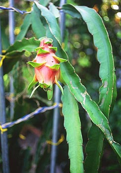 | ドラゴンフルーツの花は、夜に咲き朝方には萎んでしまう月下美人のようなサボテンです。上の写真の赤い実がドラゴンフルーツで、甘くて癖がなく、さっぱりした味で、つぼみや花も食べられるそうです。 私が食べたのは、外側が赤で果肉が白いやつですが、果肉の色が赤や外側が黄色で果肉が白いものも栽培されているようです。 |