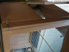 天井は巣箱内がメンテナンス出来るように開口部を作ります。この開口部は 、ヒーターの電球交換や壷巣の交換、検卵などに役立ちます。天井は小鳥の力で開く事はありませんので、配線コード用のステープルを工夫して、簡単にロックできるように小細工をしました。 |