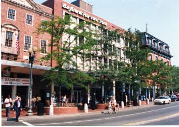 | 地下鉄レッドラインに乗ってハーバード駅に降 りました。 このあたりはハーバードスクエアと 呼ばれていて活気ある学生街です。駅の階段 を登り切った正面にケンブリッジのインフォメー ションブースがあり、地図やパンフレットが入手 できます。 |