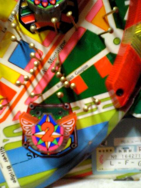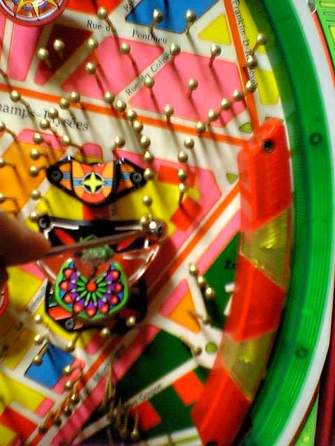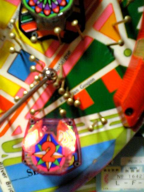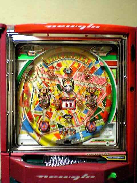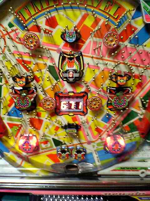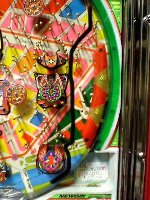 | 落としに突入した玉は、下の2回開き機械 式チューリップに入賞。 上のチューリップは、絶対に閉じないので、 店員が玉を入れてチューリップを閉めるまで 玉が出っぱなしです。。。 |