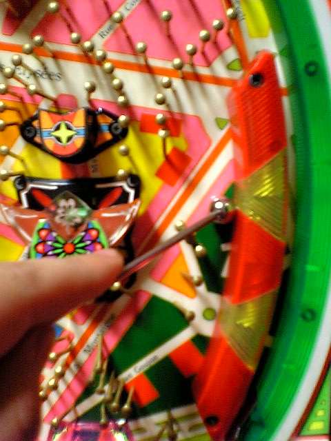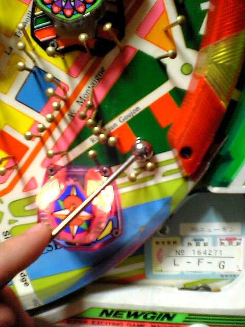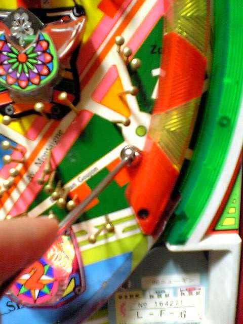 | ゲージ棒を当ててる釘に玉が、、、「右から (通常時は左からしか当たりません)」 当たって、玉が「左上」に跳ねます。 |