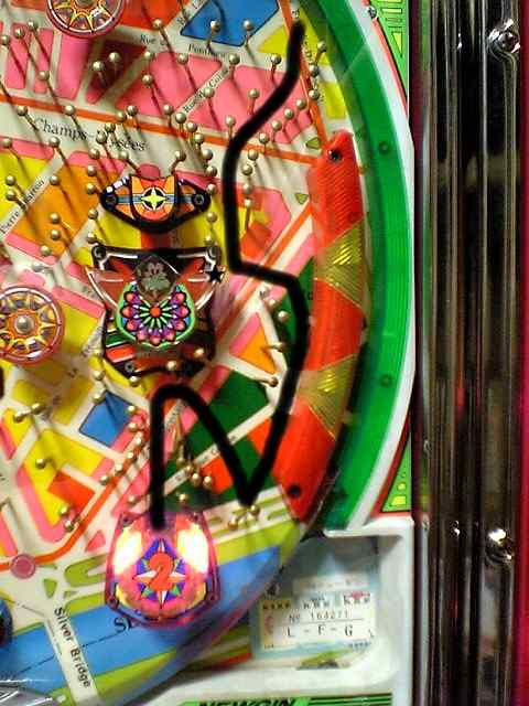 | 黒い線が、「出来上がり前」に右打ちした時 の玉の流れです。 |
